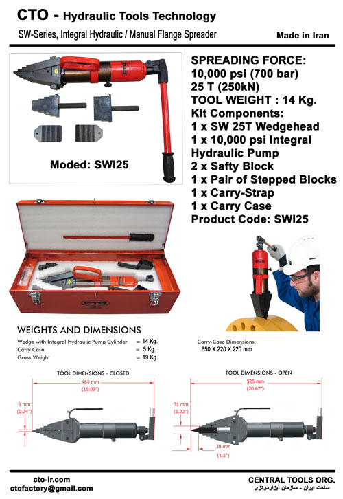 با ظرفیت 25 تن - پمپ هیدرولیک دستی سرخود - 2 عدد بلاک محافظ دسته دار - 2 عدد بلاک پله ای قابل نصب داخل صندوق فلزی قابل حمل - شش ماه گارانتی و ده سال خدمات پس از فروش - ساخت ایران - کارخانه ابزارمرکزی - برند CTO